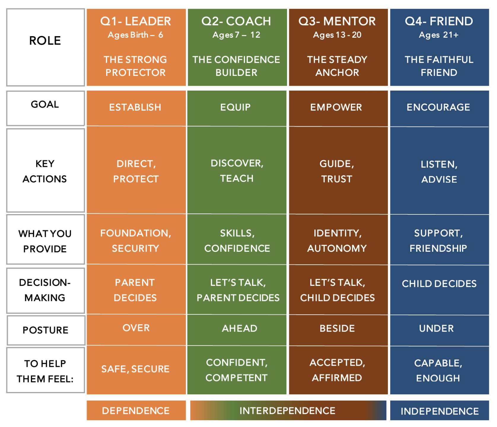 - Adjust your approach by area, not just age. For example, a 14-year-old might be ready for Q3 identity mentoring but still need Q2-style coaching around managing their time. There will be natural overlap—you might still use strategies from a previous quadrant for a while or begin to dip into the next one as your child matures.