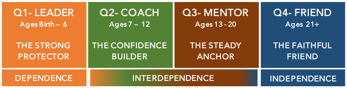 Fathers with children in young adult to adult years (ages 21+). The primary focus in Quadrant 4 is for dad to encourage his children, i.e. fulfilling the role of a Father-Friend. This is the phase where you have done your work, and the goal now is to be a supporter of your child. This quadrant involves key behaviors of listening, affirming, supporting, empowering, trusting and refraining from telling and directing. When called upon, dad can be there for advice and comfort.
